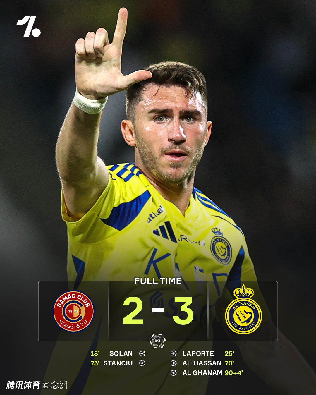 沙特联第29轮,利雅得胜利客场3-2逆转达马克,位居第3名,距榜首吉达联合8分。C罗本场轮休。索兰先拔头筹,拉波尔特扳平,哈桑替补反超,斯坦丘3分钟追平,哈纳姆补时94分钟绝杀。