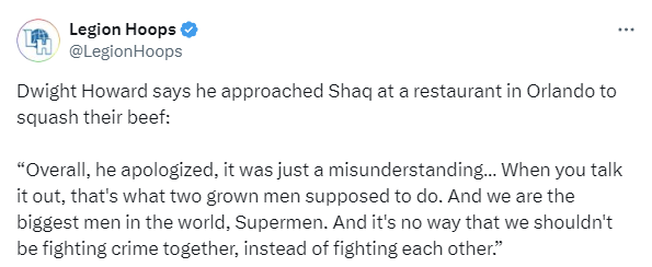 奥尼尔在霍华德打球时经常会批评后者,霍华德也多次进行反击,而双方的矛盾起因就是“超人”这个外号。当时霍华德在扣篮大赛上身披超人斗篷夺冠,但却被奥尼尔嘲讽“没戒指就敢叫‘超人’?”霍华德则还击称“你只是嫉妒我的弹跳。”双方的对喷也一直持续了整整16年之久。