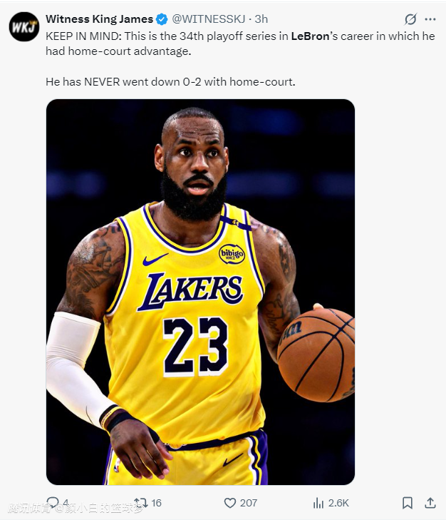 湖媒:詹姆斯生涯第34次拥有主场优势,他从未在手握主场优势时0-2落后。