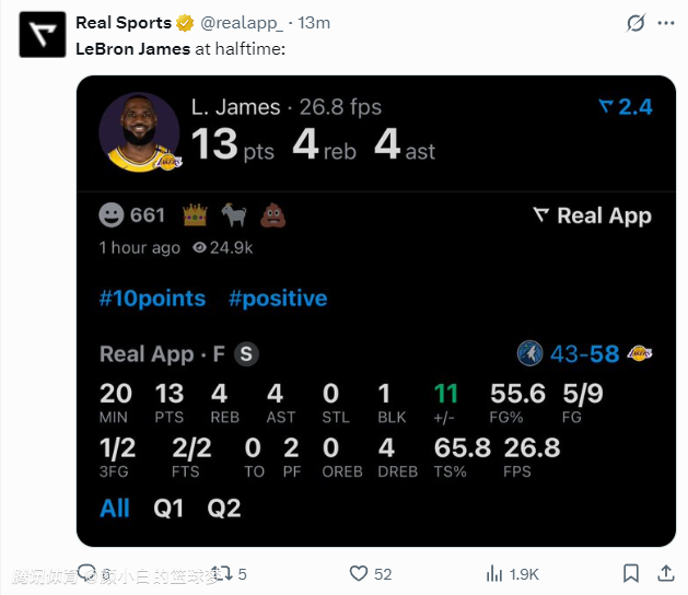 詹姆斯这个G2积极性完全不同,防守端他沉退去卡戈贝尔,再现“死亡之瞳”,老詹首节10分钟,3中2拿到4分4篮板2助攻,正负值+15,他的贡献无法用数据来形容,攻防两端40岁的老头子一丝不苟,他传给芬尼史密斯的空切更是精妙绝伦。