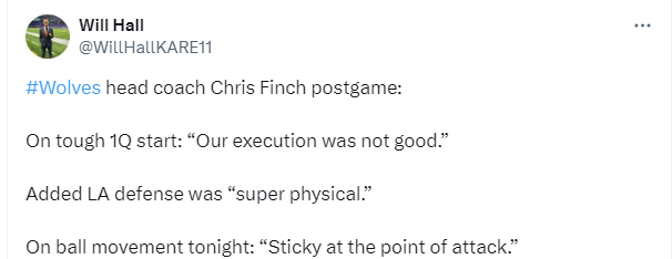 本场比赛,森林狼队在首节15-34落后湖人队19分,在谈到森林狼队首节比赛的慢热表现时,芬奇表示:“我们的执行力不够好,湖人队的身体对抗强度很高。”值得一提的是,在本场比赛之前,芬奇就曾表示:“我们预计湖人今天会强势反击,并有一个很不错的开局。这会是一个漫长的系列赛,今晚的比赛会很艰难。”
