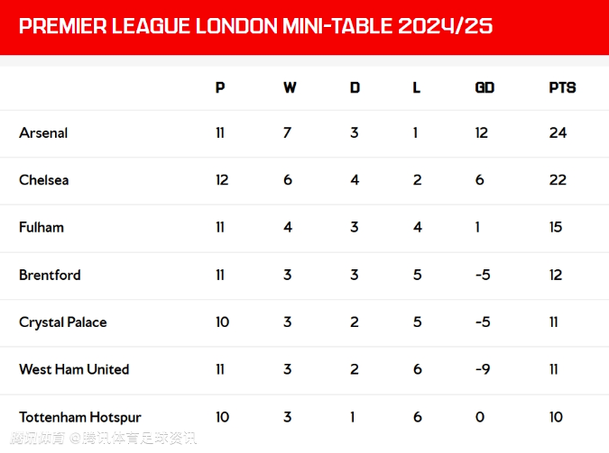 目前阿森纳11场伦敦德比7胜3平1负,24分领先迷你积分榜第二名切尔西22分,但切尔西已经完成本赛季的12场伦敦德比,积分上无法超越阿森纳。