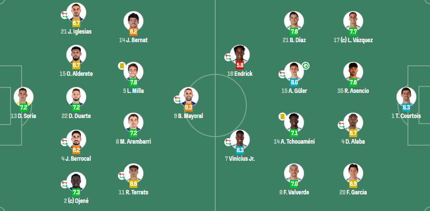 皇家马德里(4-4-2):库尔图瓦;卢卡斯-巴斯克斯,劳尔-阿森西奥,阿拉巴(46'卡马文加),弗兰-加西亚;布拉欣-迪亚斯,居莱尔(78'塞瓦略斯),琼阿梅尼,巴尔韦德;恩德里克(65'贝林厄姆),维尼修斯(73'罗德里戈)