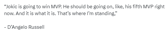 丹吉洛-拉塞尔在节目中表示:约基奇会赢得MVP,他现在本应该已经拿到第五个MVP了。事情就是这样,我的立场就是这样。