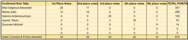 据统计,目前有42名投票人公布了他们本赛季常规赛MVP的选票——亚历山大获得28张第一选票,总分为357分;约基奇获得14张第一选票,总分为266分,字母哥没有获得第一选票和第二选票,20张第三选票,总分为109分。
