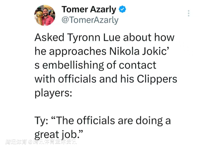 当被问及如何看待约基奇在与快船队球员接触时夸大身体对抗的问题时,泰伦-卢说道:“裁判们做得很好。”
