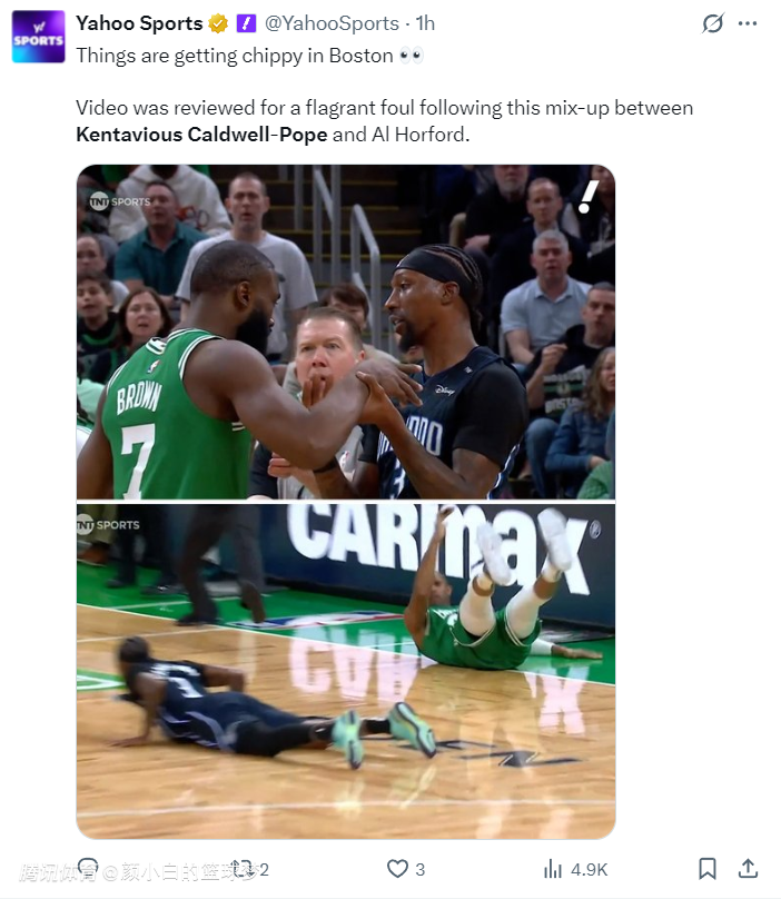 波普在G1是5中2拿6分,这场G2他首节没有出手,他整个上半场最高光的瞬间就是与布朗发生冲突,他背对霍福德撞倒了霍福德,布朗以为波普是故意的双方大面积冲突,裁判介入后看回放显示是一个背后的后退不是故意只给了普通犯规