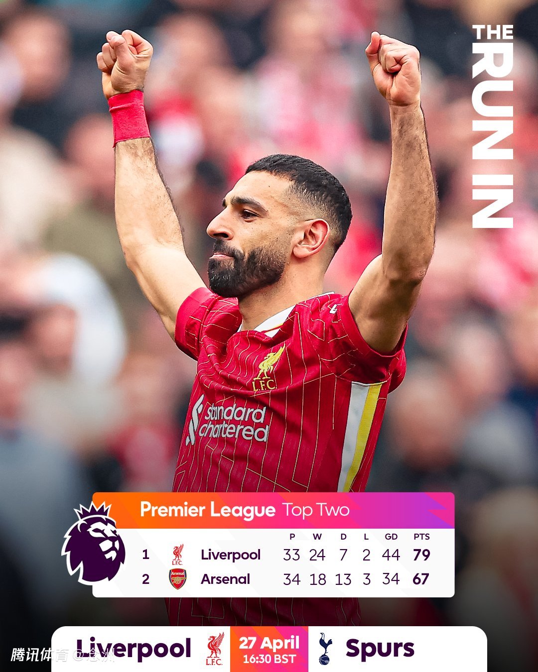 而目前,位居榜首的利物浦33轮已经积79分,因此,他们只要在本周日主场对阵热刺的比赛中保持不败,至少拿到1分,就可以提前夺得本赛季英超冠军!