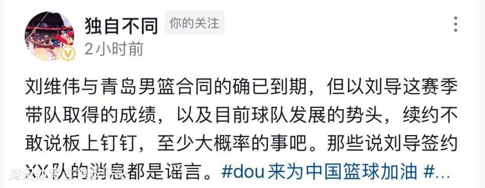 不久前,根据青岛跟队记者“杜金城”发文:刘维伟与青岛男篮合同的确已到期,但以刘导这赛季带队取得的成绩,以及目前球队发展的势头,续约不敢说板上钉钉,至少大概率的事吧。那些说刘导签约XX队的消息都是谣言。