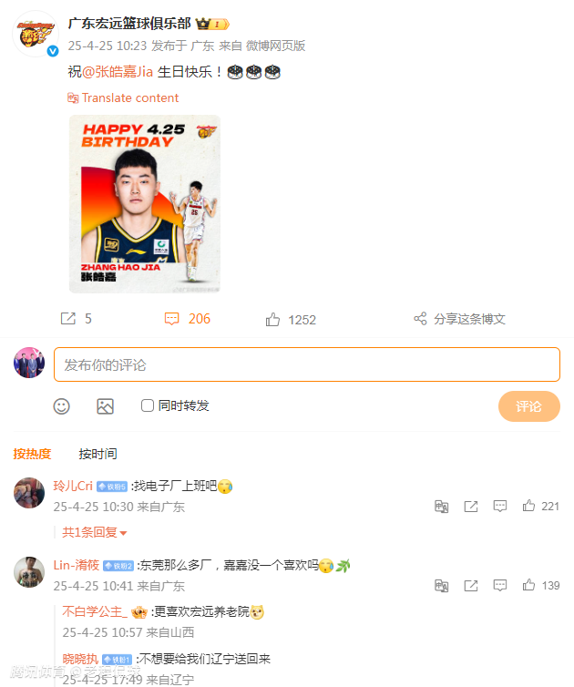 2025-04-25 22:50广东男篮在今天为球队前锋张皓嘉送上生日祝福。但不同于很多球员生日收获球迷的祝福,张皓嘉生日收获的几乎是清一色的球迷“离队请愿”。
