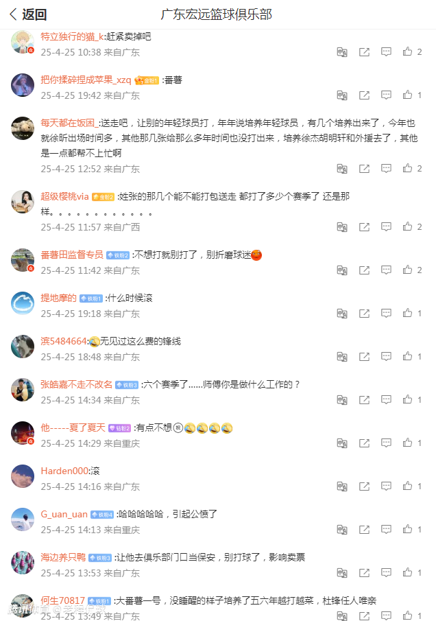 还有广东队球迷表示:“下赛季还在广东的话,绝对不会再关注广东”、“顺便希望这是官博发的最后一次祝福,好聚好散行嘛!”“六个赛季了……师傅你是做什么工作的?”