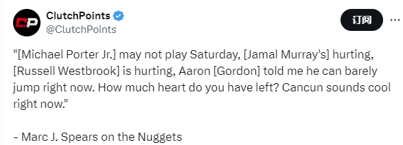 该记者在节目中说道:“小迈克尔-波特周六(北京时间周日)可能打不了,贾马尔-穆雷受伤了,拉塞尔-威斯布鲁克也有伤,阿隆-戈登告诉我他现在几乎跳不起来。你们还剩多少心气?坎昆(墨西哥著名旅游城市)现在听起来不错哦。”