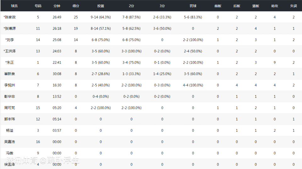 此役,中国U19男篮全队3人得分上双,陈家政14中9得到25分4助攻,成为全场得分最高的球员。张博源14中8得到19分4篮板,刘李8中6高效得到14分,朱正5中3得到8分9助攻,王洪泽、李悦州与崔新泉也均是得到8分。