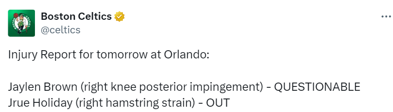 凯尔特人最新伤情:杰伦-布朗出战成疑 霍勒迪缺席G4比赛