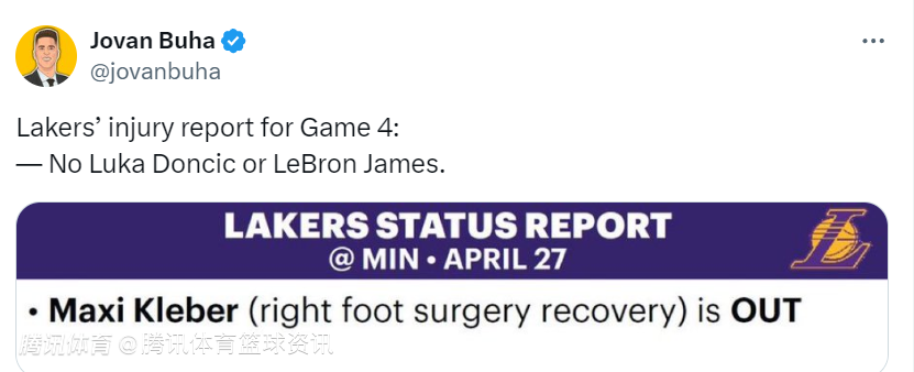 2025-04-27 07:00北京时间4月27日,湖人官方更新球队伤情报告,全队仅克勒贝尔(右脚手术恢复中)确定缺席与森林狼的第4场比赛,东契奇和詹姆斯均未出现在伤病名单中。