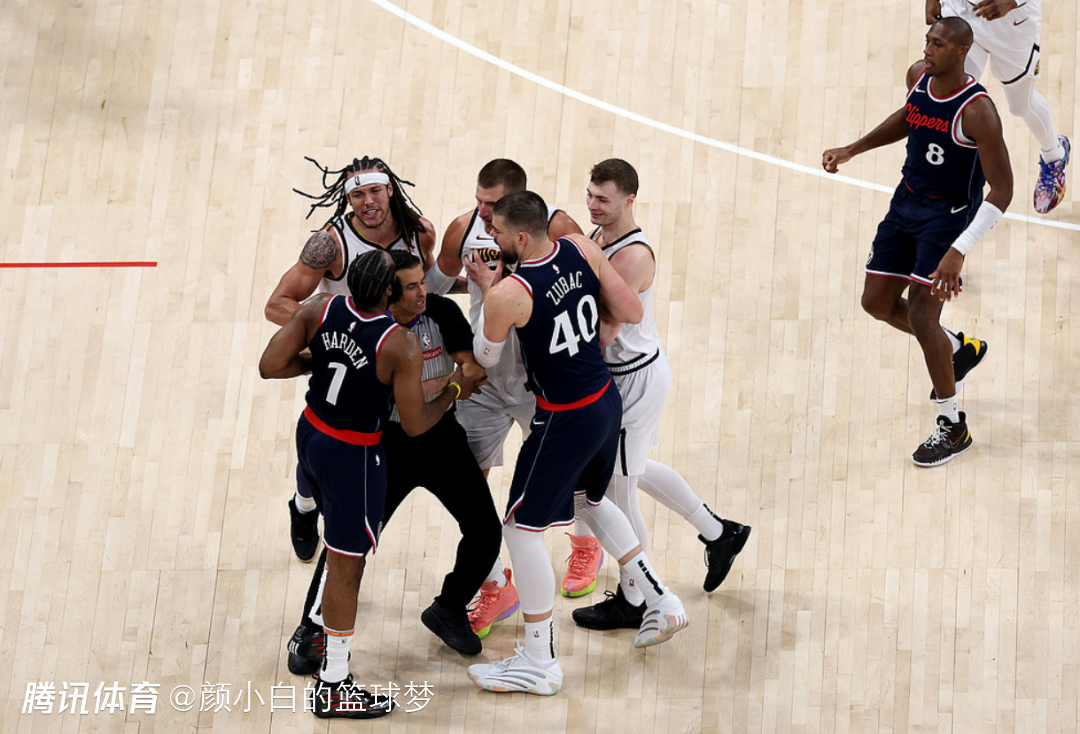 邓恩半场7中1,巴图姆半场4中1,波格丹半场6中2,从这些角色球员的效率就能看出掘金的防守提升的不止一星半点,哈登半场也只有4中2+三分1中1拿到6分7助攻4篮板1抢断2盖帽,要知道哈登G3半场拿到20分。半场结束前两队还发生巨大的冲突,快船这边哈登、鲍威尔、邓恩都吃了T。