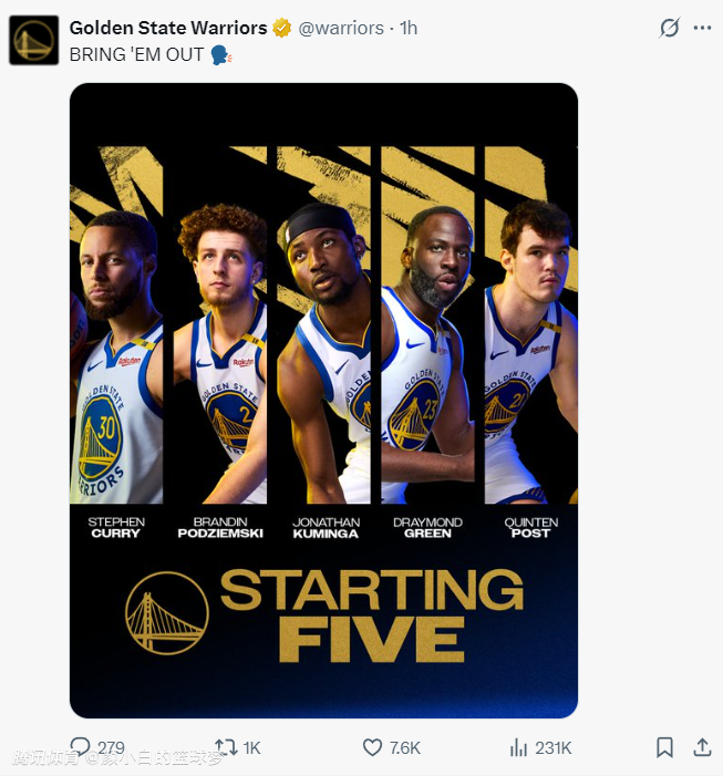 这场比赛巴特勒因为臀部伤势缺席,科尔让库明加先发。赛前还有一个小插曲,库里在接受采访时提到库明加只要被叫到名字就该做好准备,而库明加接受采访时透露不想听到什么上场就要做好准备的言论。首节这两人发挥都不佳,库里4中1+三分3中0拿2分,库明加2中1拿2分,科尔放弃五小先发提上波斯特还是乏力。