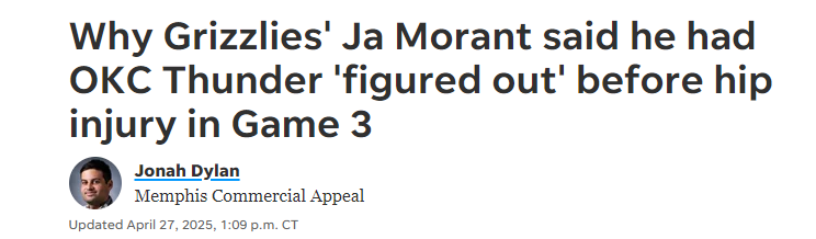 2025-04-28 04:40北京时间4月28日,灰熊举办赛季告别采访,他们在首轮0-4不敌雷霆,惨遭淘汰。莫兰特因伤未能出战最后一场比赛,他在采访中自信表示,如果不是自己在第三场中途伤退,系列赛的总比分现在应该是2-2。
