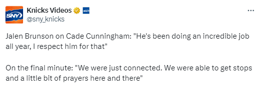 布伦森:最后时刻我们防住对手还有点运气眷顾 坎宁安赛季表现令我敬重