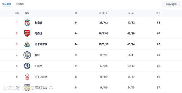 利物浦锁定冠军,阿森纳前5也没有太大悬念,3-5名之争极为惨烈。纽卡34场62分,曼城34场61分,切尔西34场60分,诺丁汉森林33场60分,维拉34场57分,5支球队竞争3-5名!