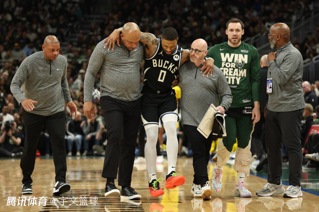利拉德无对抗倒地疑似跟腱撕裂,随后在工作人员搀扶下一瘸一拐地返回更衣室,本场比赛没有回归