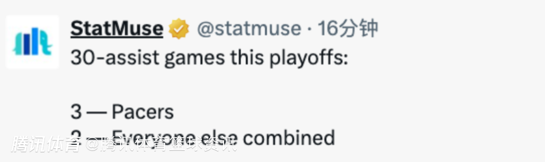 本场比赛,步行者全队一共送出36次助攻,这样一来,他们在季后赛至今已经3次送出30+的助攻,而其他球队合计才只有2次。