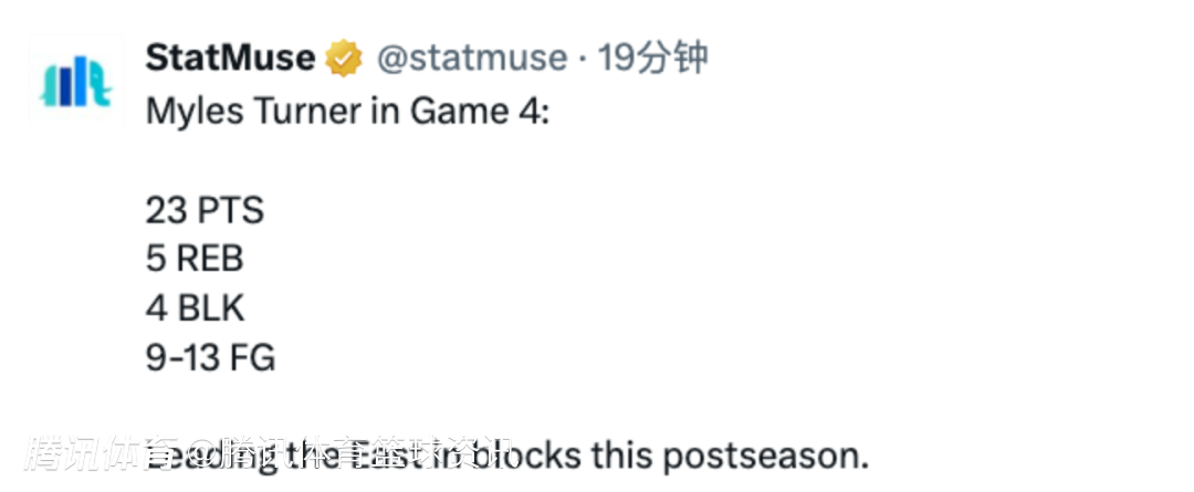 特纳本场比赛首发出战29分钟,13中9,拿到23分5篮板3助攻4盖帽。他是目前季后赛东部球员盖帽数最多的球员,另外他在步行者队史季后赛盖帽排行榜上位列第四位。