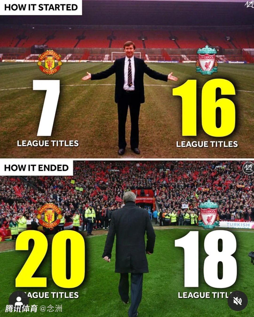 “把利物浦从王座上踢下去,这是我执教生涯的最大成就!”弗格森的这句名言,也是曼联球迷的骄傲。因为在英超成立之前,曼联只有7个顶级联赛冠军,但是英超时代的13冠,让他们以20冠超越18冠的利物浦,成为英格兰历史第一。