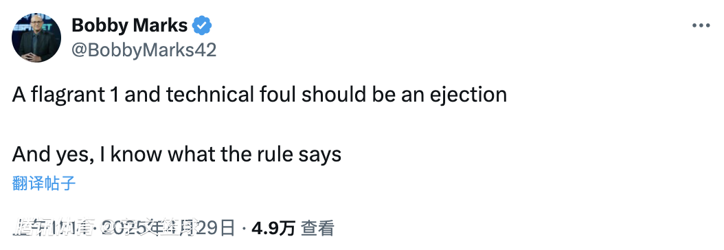 名记Bobby Marks直言像追梦格林这样吃到一个技术犯规和一次恶意犯规的球员,就该被驱逐离场。当然,Marks非常明白联盟并没有这样的相关规则。事实上,这也是Marks对规则的一次质疑,按照FIBA规定,单场比赛里吃到这种程度的犯规就会被驱逐离场,但在NBA里面却不会,某种程度上这也是联盟利用规则漏洞,保住了追梦格林。