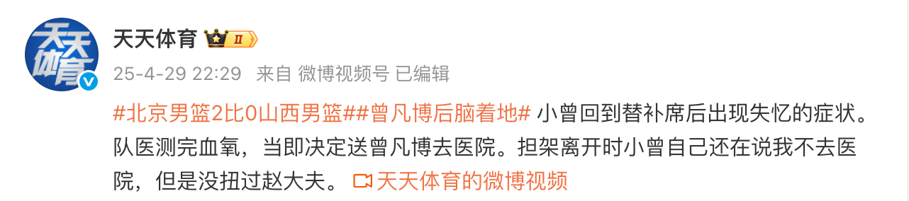 2025-04-29 22:50北京时间4月29日,CBA季后赛,北京男篮客场以106-99击败山西男篮,总比分2-0领先。第三节比赛,曾凡博受伤倒地,随后在场边接受治疗,但最终还是被抬上担架送往医院,被治疗时曾凡博还表示自己不想去医院,还继续战斗。