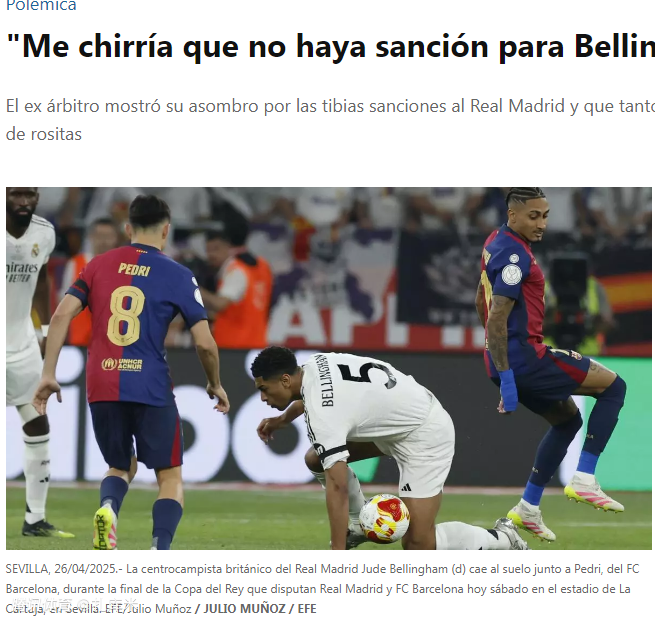 2025-05-01 05:10前裁判爱德华多・伊图拉尔德・冈萨雷斯针对西班牙足协纪律委员会处罚皇马的决定非常不理解,认为非常纵容皇马的违纪行为,包括吕迪格在内的处罚都太轻。