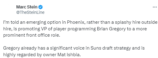 Marc Stein写道:“我得知,在太阳队内部,相较于从外部聘请一位引人注目的人选,一个逐渐浮现的选择是将负责球员发展规划的副总裁布莱恩-格雷戈里提拔到一个更重要的球队管理层职位上。”