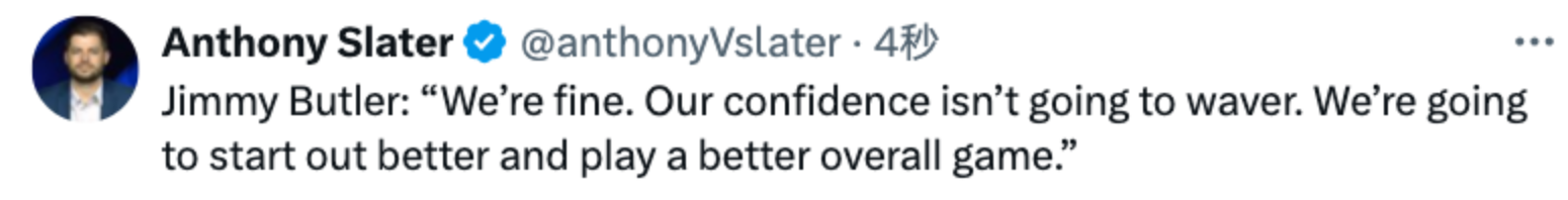 巴特勒说道:“我们状态良好。我们的信心坚定不移。我们会在比赛开局表现得更出色,并且打出一场从始至终都更精彩的比赛。”