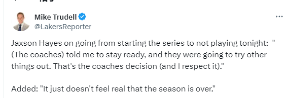 从此前的从首发中锋到今晚比赛未能登场,海耶斯表示:“教练组让我保持备战状态,他们需要尝试不同的阵容安排。这是教练的决定(我完全尊重)。”随后他补充道:“赛季就这样结束了,真的让人感觉不太真实。”