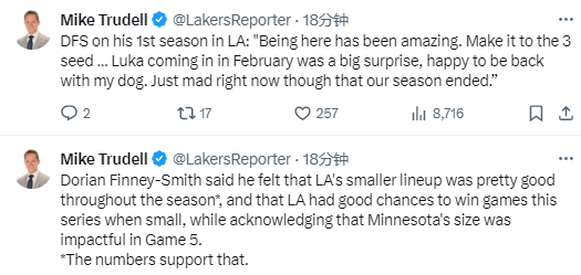 2025-05-01 14:00北京时间5月1日,NBA季后赛继续进行,湖人在首轮G5比赛中以96-103不敌森林狼,1-4被对手淘汰出局。本场比赛中,湖人球员多里安-芬尼-史密斯出战29分钟,全场5中3,其中三分3中1,得到7分4篮板2助攻1抢断。赛后,他接受媒体采访。