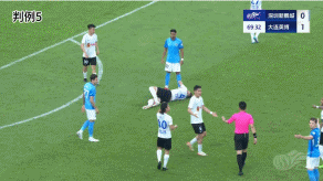 判例五:中超联赛第9轮,深圳新鹏城VS大连英博,比赛第70分钟,深圳新鹏城27号队员与大连英博4号队员疑似发生肢体接触,大连英博4号倒地。裁判员未判罚犯规,VAR未介入。