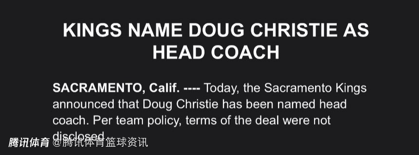 总经理斯科特-佩里表示:“经过慎重考虑,我非常高兴地宣布道格-克里斯蒂成为萨克拉门托国王队的下一任主教练。”