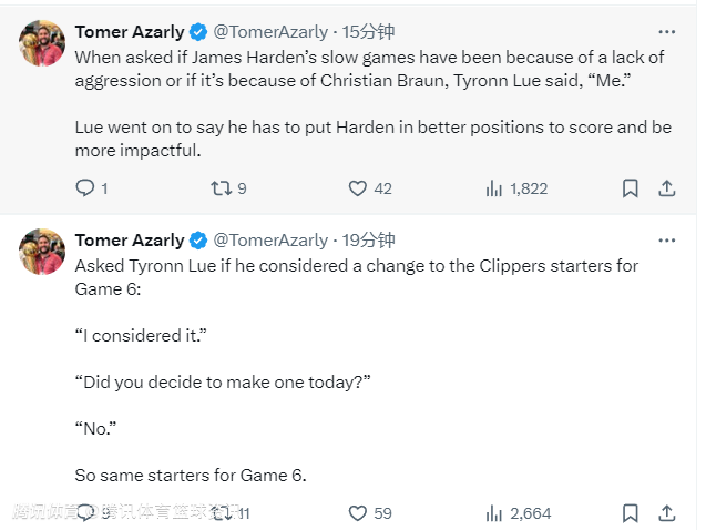 泰伦-卢:快船不会改变首发阵容 要让哈登处于更容易得分位置上