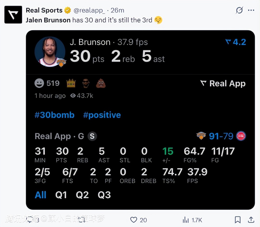 好在第三节布伦森12分钟,6中3+三分2中1拿到10分2助攻,他又在第三节爆发了,他还帮助布里奇斯与阿奴诺比都上20+,三节布伦森30分5助攻2篮板,三节已经完成30+,尼克斯已经三人20+领先到11分。