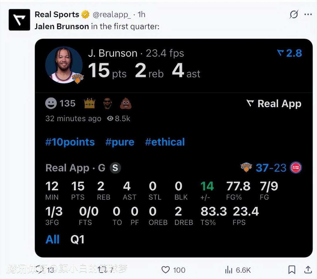 这场比赛布伦森开场就展现了超强的得分欲望,他就希望在客场晋级,如果进入抢七,就算有主场优势一切都难说了。他首节12分钟,9中7,三分3中1,拿到15分4助攻2篮板。
