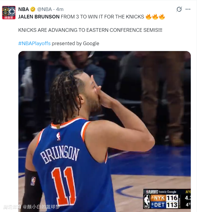 2025-05-02 11:00北京时间5月2日,尼克斯以116-113击败活塞,大比分4-2晋级次轮 。末节活塞一度都领先7分了,但布伦森一人接管比赛,他不仅迫近比分还在终场前4.3秒命中准绝杀三分,他送了一个飞吻给汽车城球迷,因为他知道比赛结束了。