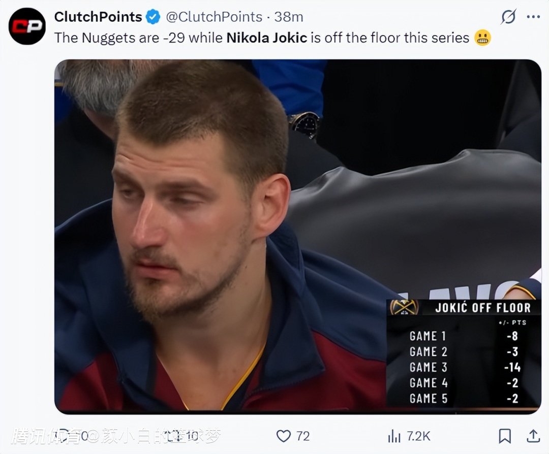 官方转播发布了一组数据,这组系列赛当约基奇不在场时,G1:-8、G2:-3、G3:-14、G4:-2、G5:-2,换言之约基奇一下场掘金就要输分,这就是联盟第一人的统治力。