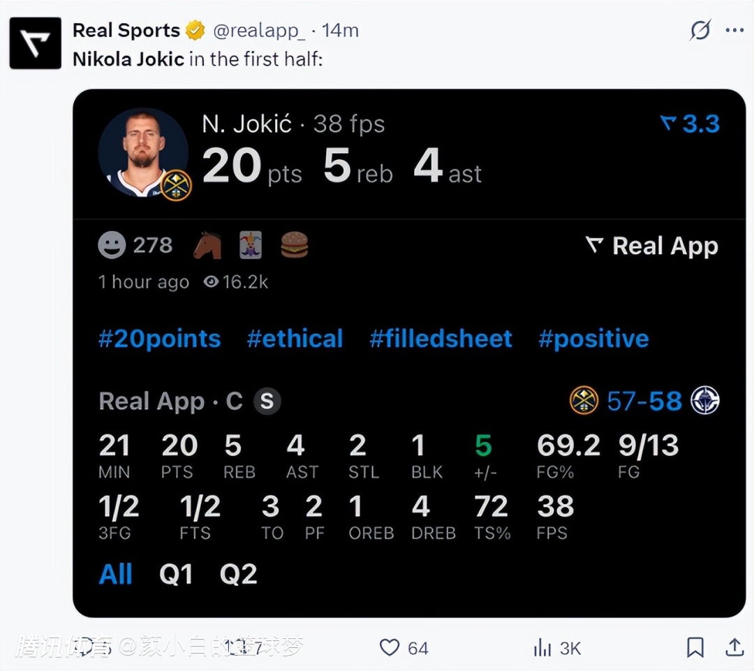 首节约基奇3中2+三分1中1拿到5分3助攻2篮板1抢断1盖帽,他努力带队全队;次节哈登单节17分大爆发,约基奇单节9分钟10中7拿到15分3篮板1助攻1抢断,半场约基奇13中9拿20分5篮板4助攻2抢断1盖帽,他对飚哈登的21分。
