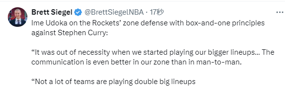 乌度卡在谈到火箭队为何会使用双塔并用一盯四联的区域联防来应对库里时表示:“当我们开始使用更大个的阵容时,采用这套防守体系就成了刚需。队员们在联防中的沟通甚至比人盯人时更顺畅,现在联盟没几支球队打双高阵容,但我们很享受它带来的优势。”