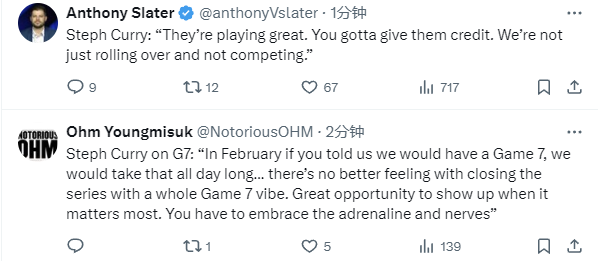 库里表示:“火箭打得非常出色,你得承认这一点。我们也不会就此认输,不会放弃拼搏。我并没有感觉很疲惫,但如何破解火箭队的区域联防对我们的精神是个挑战,我们需要在进攻端找到空位的球员,保持耐心并命中投篮。这轮系列赛是场苦战,我们在抢七大战的经验需要体现在自信和耐心上。”