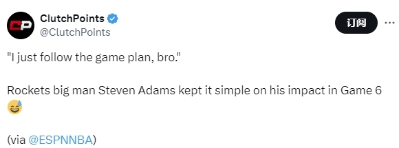在谈到自己在比赛中所发挥的作用时,亚当斯说道:“我做了什么改变?我不确定。我只是按照比赛计划来打球,伙计。我们很好执行了防守计划。”在谈到本场比赛火箭队所使用的一盯四联战术时,亚当斯说道:“这是一种很奇怪的区域联防,相当怪异,但确实很有效。”