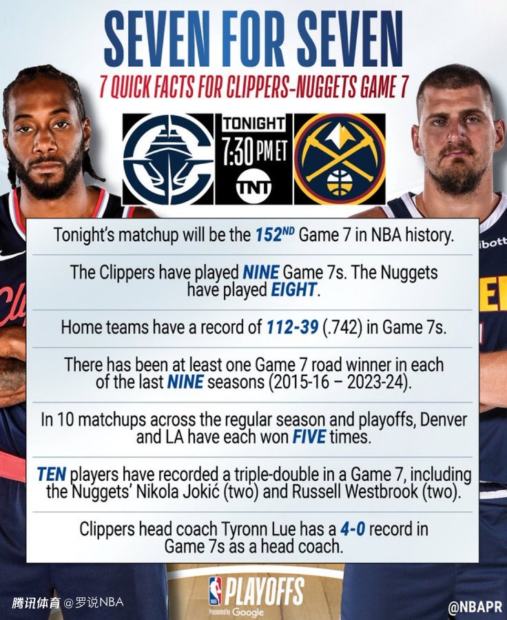 2025-05-04 05:40北京时间5月4日,掘金主场对阵快船,打响抢七生死战。究竟哪一支球队能成功晋级,与雷霆会师西部半决赛呢?赛前,NBA官方晒出了一组相关数据,坐镇主场的掘金拥有历史胜率的优势,但卢指导执教生涯抢七还没输过。具体如下——