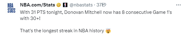 在米切尔之前,这一纪录的保持者是迈克尔-乔丹,他曾两度连续7次在系列赛第一场比赛中得到30 +的分数,科比-布莱恩特和张伯伦曾连续6次在系列赛第一场比赛中得到30 +的分数,英格力什曾连续5次在系列赛第一场比赛中得到30 +的分数。