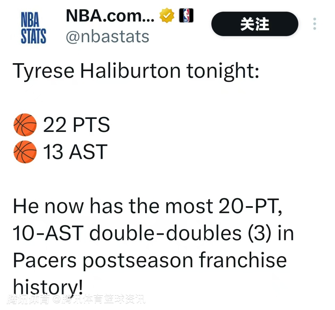 根据数据统计显示,凭借本场两双表现,哈利伯顿在步行者队季后赛队史中拥有最多的20+10两双数据(3次)。