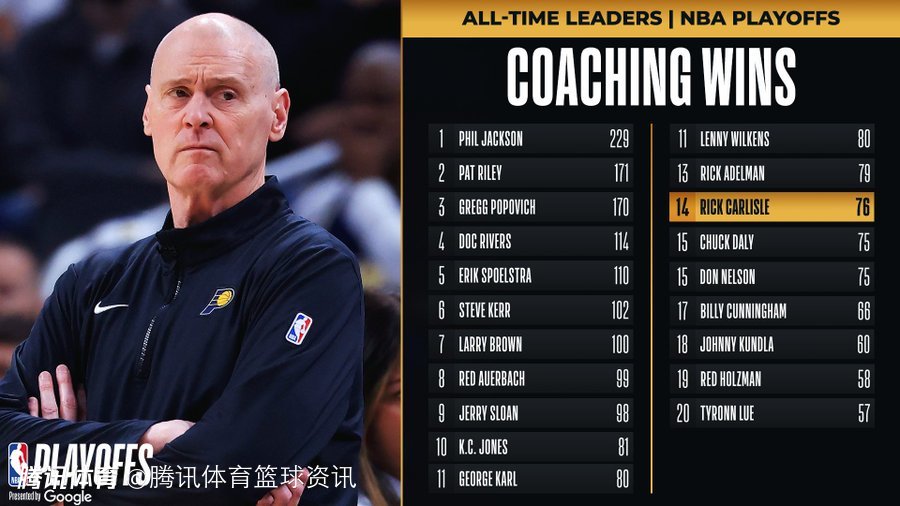 根据数据统计显示,凭借本场胜利,步行者主教练卡莱尔的季后赛胜场数已达76场,超越查克-戴利和老尼尔森,升至历史第14位。排在他之前的里克-阿德尔曼胜场数为79场,如果步行者能在本轮淘汰骑士,他将能追平这位名帅。